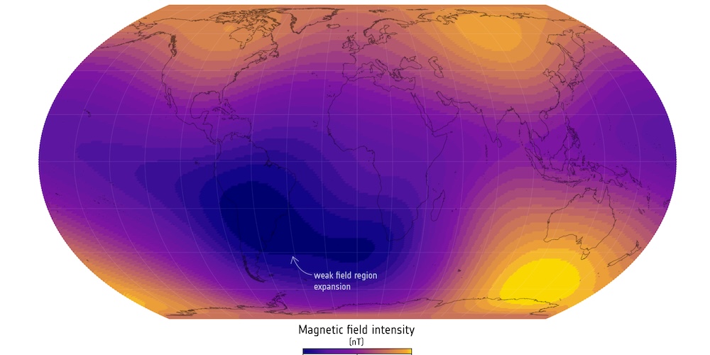 Een zwakke zone in het magnetisch veld van de aarde, dat gekend is als de 'South Atlantic Anomaly', is de afgelopen tien jaar met een oppervlakte ter grootte van ongeveer de helft van het Europese vasteland gegroeid. Dat blijkt uit gegevens die de afgelopen 11 jaar zijn verzameld door de Swarm-satellietconstellatie van de Europese ruimtevaartorganisatie ESA.