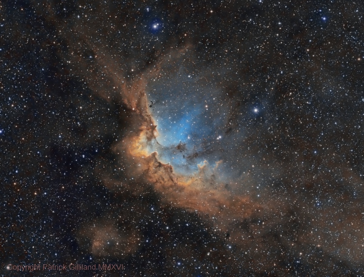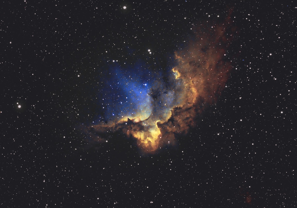 Er zijn deep-sky objecten die indrukken nalaten door hun helderheid, door hun afmetingen of door hun wetenschappelijke betekenis. En dan zijn er objecten die een indruk nalaten door iets wat moeilijker te benoemen is, een combinatie van vorm, kleur, structuur en context die samen iets creëert wat de verbeelding onmiddellijk grijpt en niet meer loslaat. NGC 7380, de Wizard Nebula (Toveraarsnevel), behoort tot die categorie. Op 7.200 lichtjaar afstand, in het hart van de Perseusarm, spreidt een mysterieuze 'tovenaar' zijn kosmische mantel.