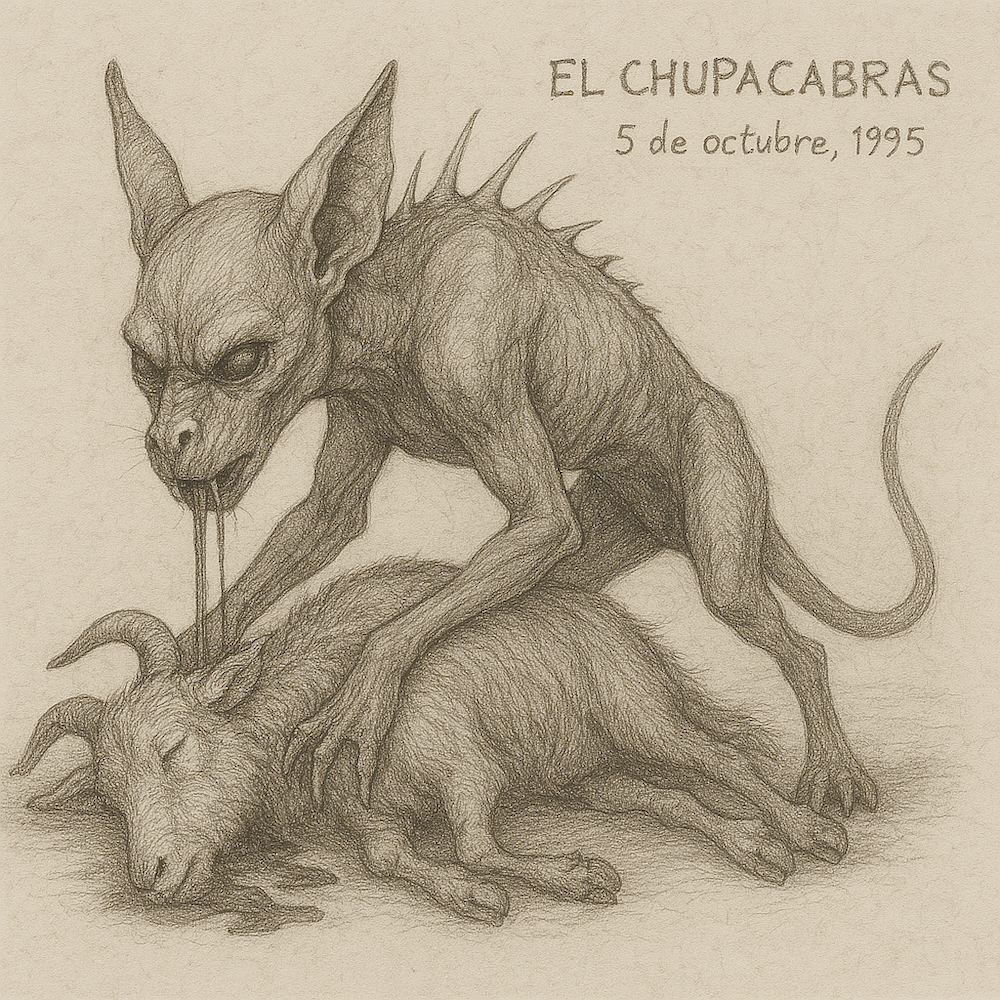 De naam El Chupacabra komt uit het Spaans en betekent letterlijk “de geitenzuiger”. De term verwijst naar het vermeende gedrag van het wezen: het zou het bloed van vee opzuigen, met name van geiten. Hoewel verhalen over vampierachtige dieren al eeuwenlang bestaan in verschillende culturen, duikt El Chupacabra in zijn moderne vorm pas midden jaren negentig op. In 1995 wordt Puerto Rico opgeschrikt door een reeks bizarre dierendoden. Boeren melden dat hun vee ’s nachts wordt aangevallen. De dieren vertonen kleine, ronde gaatjes in de hals of borst en zouden volledig zijn leeggebloed. In augustus van dat jaar verklaart een vrouw uit het stadje Canóvanas dat zij een vreemd wezen heeft gezien: ongeveer anderhalve meter groot, rechtop lopend, met grote rode ogen, stekels op de rug en een reptielachtig uiterlijk. Haar beschrijving wordt breed opgepikt door de media, en binnen enkele weken verspreidt het fenomeen zich als een lopend vuurtje. Wat volgt is een explosie van meldingen, niet alleen in Puerto Rico, maar ook in Mexico, Chili, Nicaragua en later zelfs in Texas en Arizona. Overal duikt dezelfde naam op: El Chupacabra.