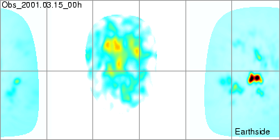 15 maart 2001. Carrington kaart van de magnetische flux aan de aardzijde en de geschatte flux aan de farside. Regio 9393 bevindt zich op Carrington lengtegraad 154 en breedtegraad 17 noord, de regio werd het eerst ontdekt op de farside afbeeldingen op 12 maart en kon op 13 maart gezien worden als een grote regio (donkere vlek rechts in beeld op de aardzijde). |