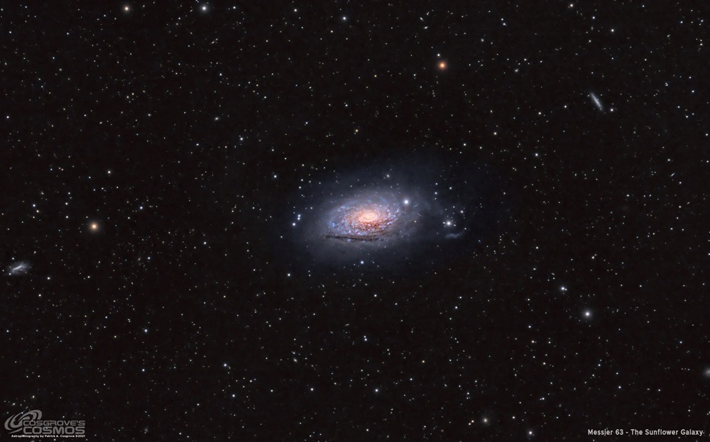 M51 staat in mei op zijn absolute best. Het sterrenbeeld Canes Venatici passeert bijna door het zenit, wat betekent dat M51 extreem hoog aan de hemel staat met minimale atmosferische verstoring. Dit is dé maand om M51 te observeren en fotograferen. De hoge positie gecombineerd met stabiele mei-atmosfeer maakt het mogelijk om de fijnste details te zien en vast te leggen. Met 25-30 cm telescopen zijn de spiraalarmen duidelijk zichtbaar, inclusief individuele knooppunten van stervorming. Voor fotografen is mei ideaal voor M51. Hoewel de nachten korter zijn, compenseert de hoge positie en stabiele lucht dit. Integratie tijden van 4-6 uur zijn voldoende om spectaculaire resultaten te krijgen met de gedetailleerde spiraalstructuur en de interactie met NGC 5195. - M63 (Sunflower Galaxy)