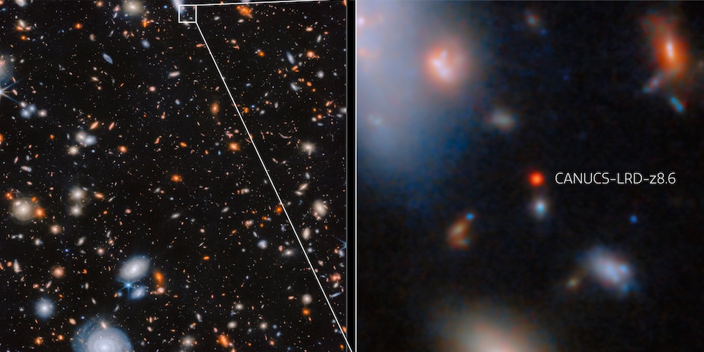 Onderzoekers die gebruikmaken van de James Webb-ruimtetelescoop van NASA/ESA/CSA hebben een actief groeiend superzwaar zwart gat bevestigd in een sterrenstelsel dat slechts 570 miljoen jaar na de oerknal is ontstaan. CANUCS-LRD-z8.6 maakt deel uit van een klasse kleine, zeer verre sterrenstelsels die astronomen voor een raadsel stellen. Het vormt een essentieel stukje van deze puzzel en daagt bestaande theorieën over de vorming van sterrenstelsels en zwarte gaten in het vroege heelal uit. De ontdekking legt een verband tussen vroege zwarte gaten en de lichtgevende quasars die we vandaag de dag waarnemen.