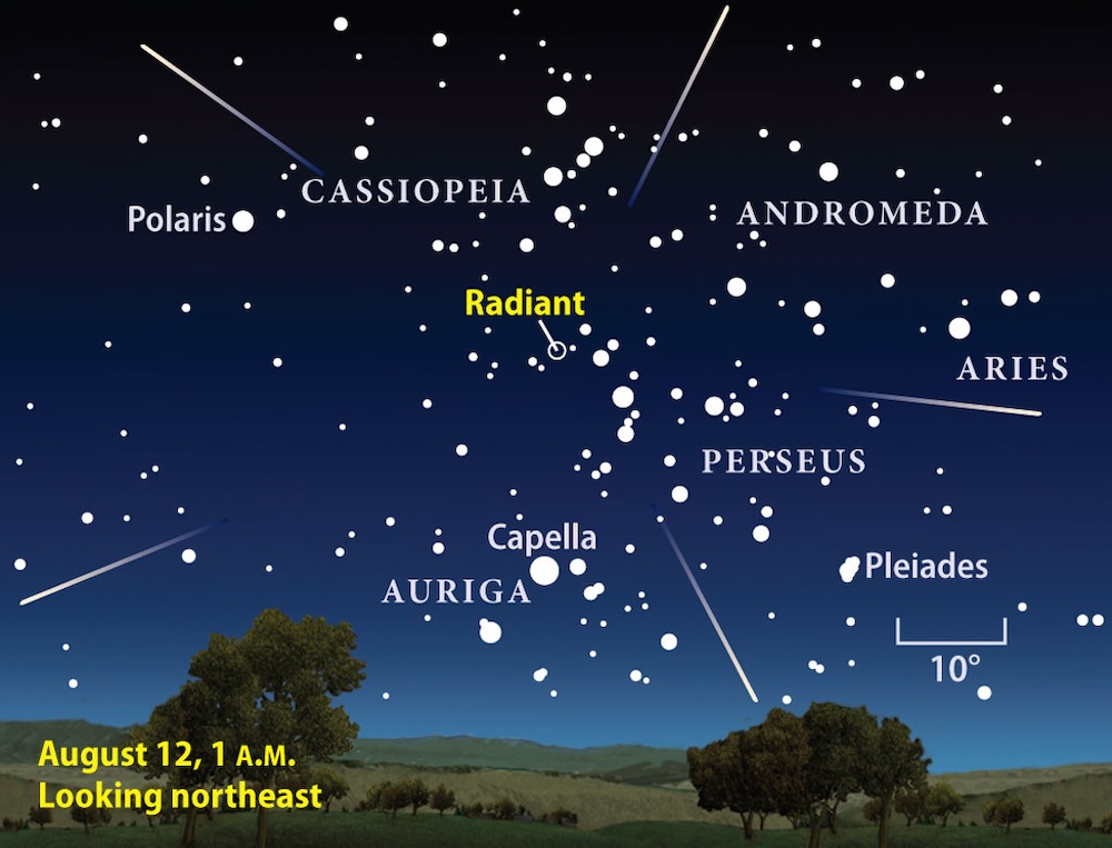 De Perseïden zijn misschien wel de bekendste meteorenzwerm. Ze bereiken hun piek rond 11 tot 13 augustus en lijken uit het sterrenbeeld Perseus te komen. De deeltjes zijn afkomstig van komeet 109P/Swift-Tuttle. Perseïden bewegen snel, gemiddeld 59 kilometer per seconde, en zijn talrijk: tijdens een heldere nacht kan men vaak 60 tot 100 meteoren per uur zien. Het zijn meestal snelle, heldere meteoren, soms met opvallende vuurballen. - Geminiden – december