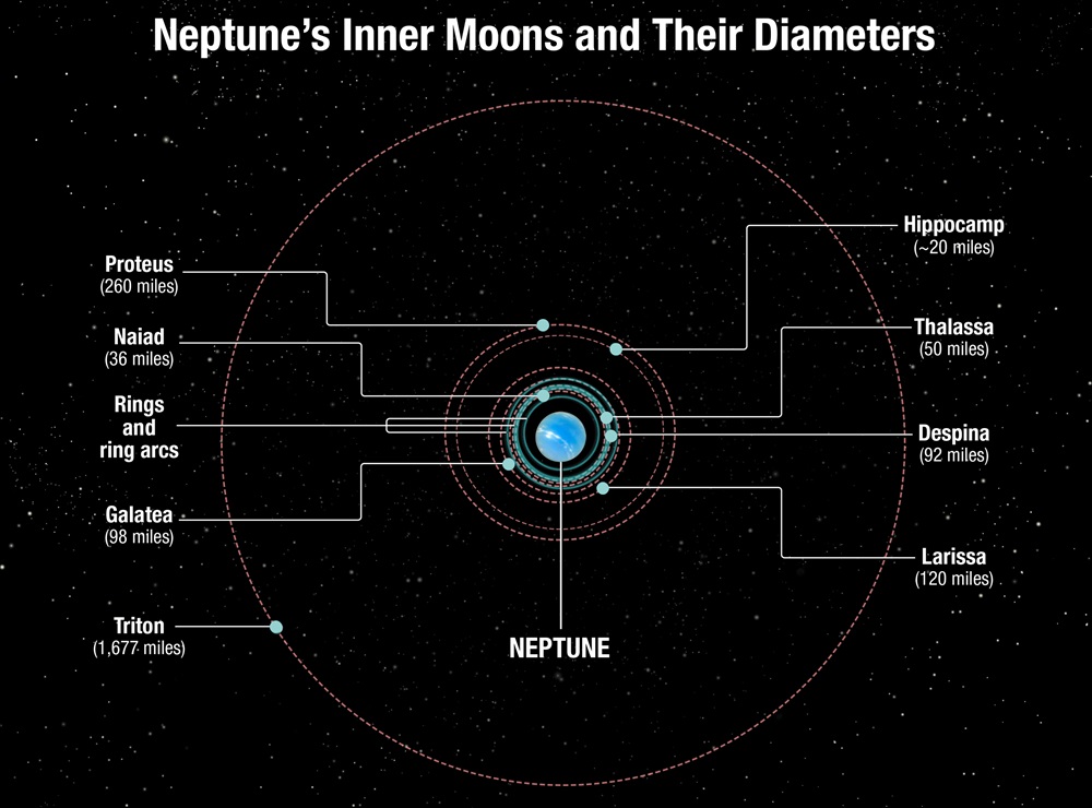 De posities van de manen rond Neptunus - Illustratie: NASA