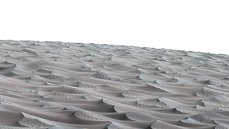 Ingekleurde 3D-afbeelding van een foto die NASA's Mars Reconnaissance Orbiter (MRO) maakte van berghellingen