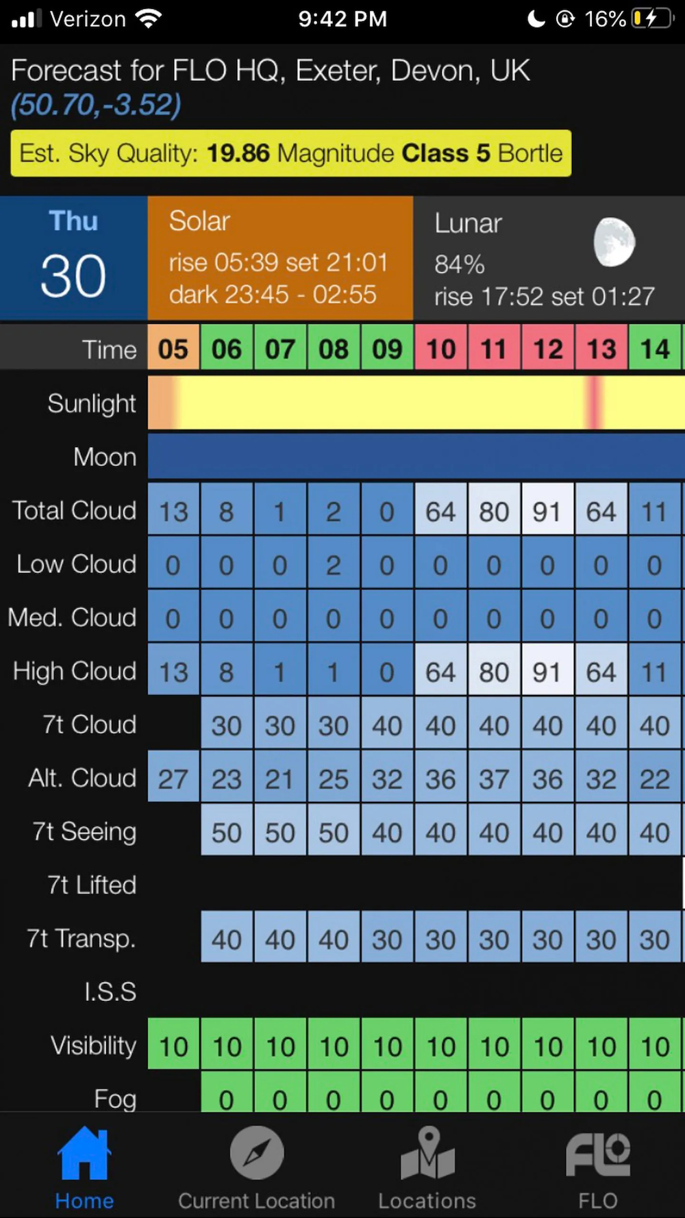 Bij het eerste gebruik stel je je locatie in. Dat kan via automatische GPS-detectie of door handmatig een plaats of coördinaten in te voeren. Dit is een cruciale stap: de voorspellingen zijn volledig locatiegebonden. Wie regelmatig op verschillende waarneemplekken observeert, kan meerdere locaties opslaan en eenvoudig tussen deze locaties wisselen. Zo kun je snel vergelijken waar de beste omstandigheden worden verwacht. Het hoofdscherm toont een overzichtelijke uur-tot-uur tabel voor meerdere dagen vooruit. Bovenaan zie je een tijdsbalk met belangrijke astronomische momenten zoals zonsopkomst, zonsondergang en de verschillende schemerfasen (civil, nautical en astronomical twilight). Vooral de periode van astronomische duisternis is essentieel voor deep-sky waarnemingen en astrofotografie. Door deze tijden te combineren met de weersvoorspelling zie je direct wanneer de hemel niet alleen donker, maar ook helder genoeg is. De kern van de app is de gedetailleerde bewolkingsinformatie. Per uur wordt de bewolking opgesplitst in lage, middelhoge en hoge bewolking, plus een totaalpercentage. Dit onderscheid is belangrijk. Lage bewolking blokkeert de hemel volledig, terwijl hoge sluierbewolking soms subtiel is maar toch voldoende kan zijn om contrast te verminderen en zwakke objecten onzichtbaar te maken op lange belichtingen. Door deze verschillende lagen te bekijken, kun je beter inschatten of een sessie zinvol is. Een korte periode met lage totale bewolking kan bijvoorbeeld perfect zijn voor een gerichte fotosessie. Daarnaast toont de app temperatuur, dauwpunt en luchtvochtigheid. Deze gegevens zijn vooral relevant voor het voorkomen van condensvorming op optiek. Wanneer de temperatuur dicht bij het dauwpunt ligt, neemt de kans op dauw sterk toe. Dit kan bepalend zijn voor de voorbereiding: je weet dan of je dauwverwarming moet gebruiken of extra maatregelen moet nemen.