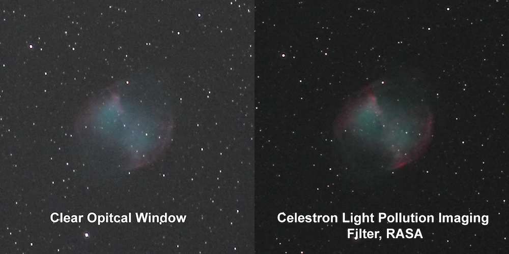 Een voorbeeld van een deepsky foto met en zonder light pollution filter - Foto: Celestron